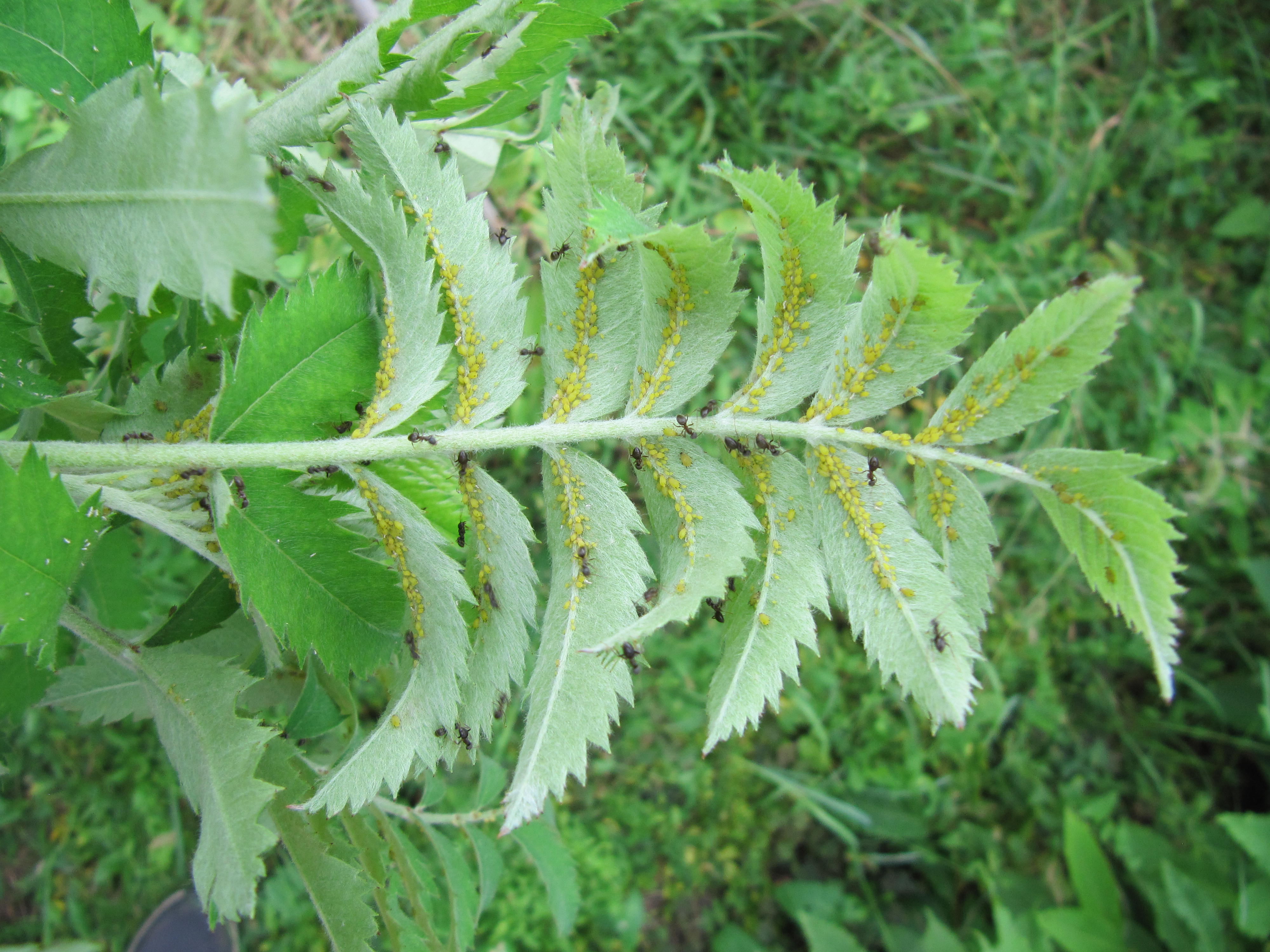 Na listoch napadnutých rastlín sú viditeľné skrútenia, deformácie a zmena farby. Na spodnej strane listov a na mladých výhonkoch sa nachádzajú kolónie zelených vošiek s lepkavou medovicou.