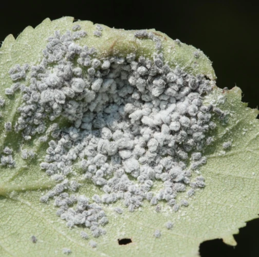 Sivé vošky na spodnej strane listov brezy. Bledožlté pľuzgiere na horných plochách listov.