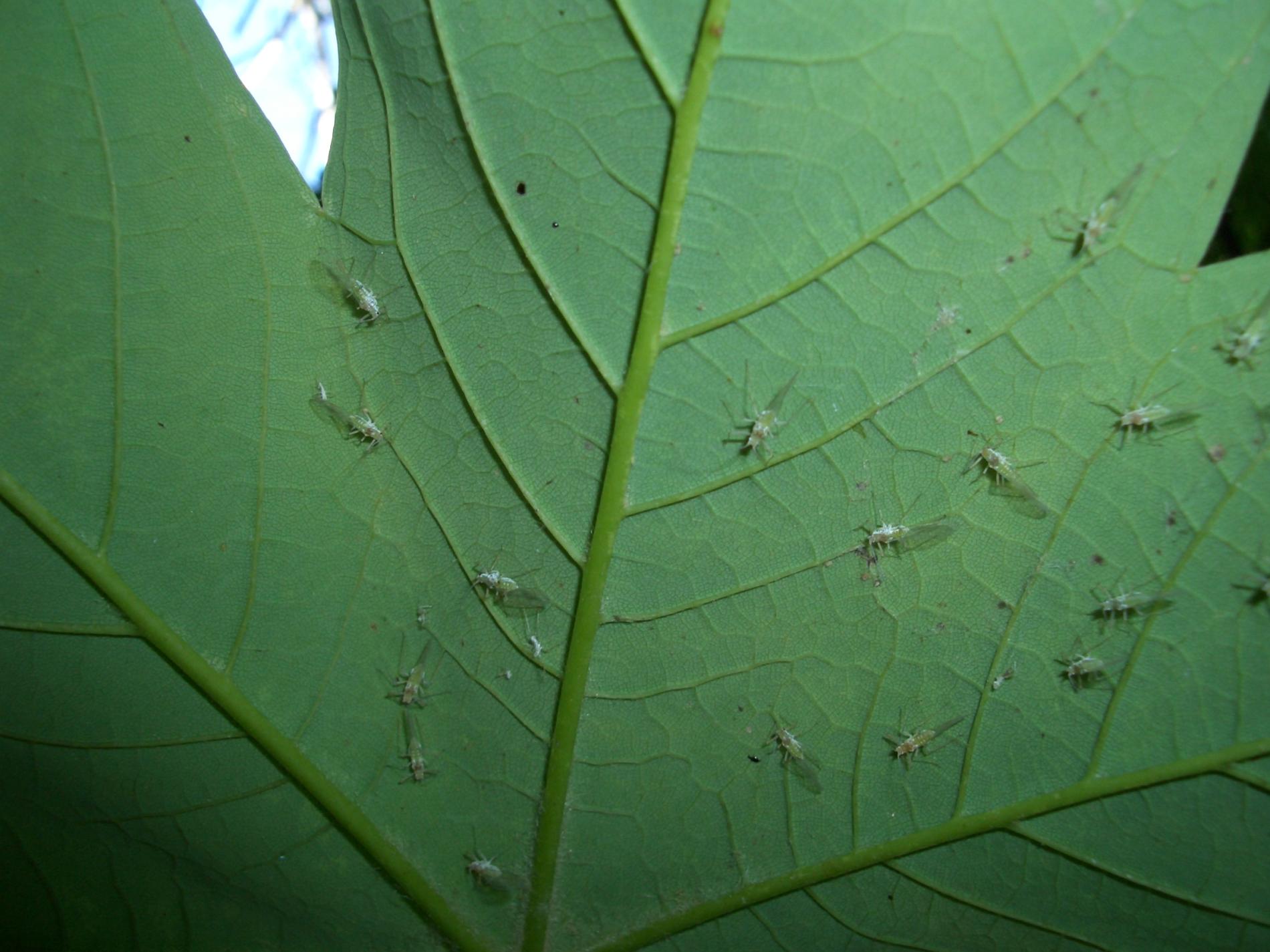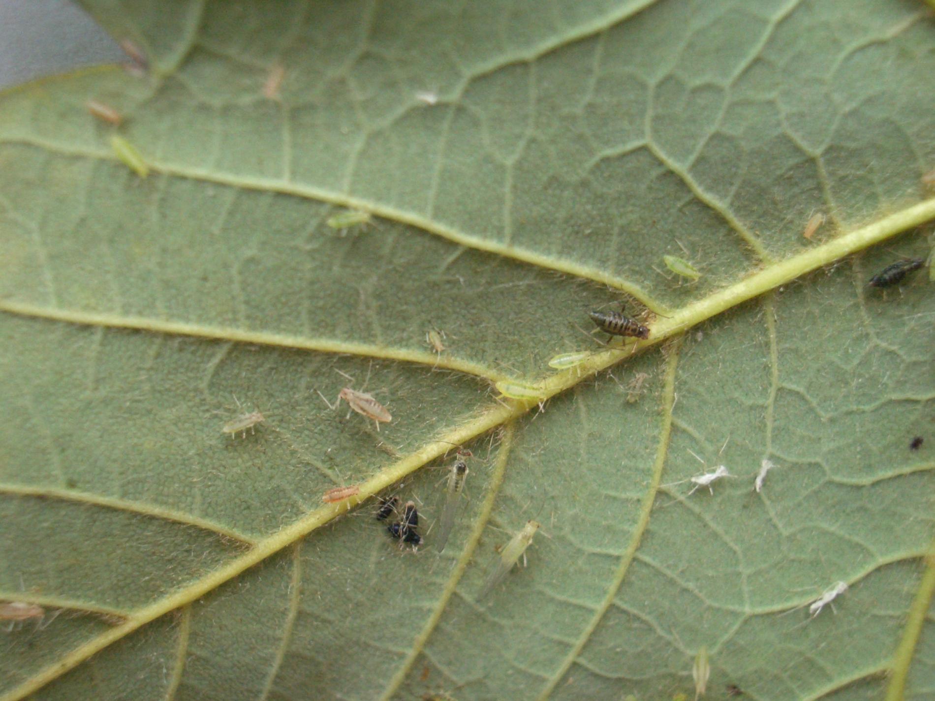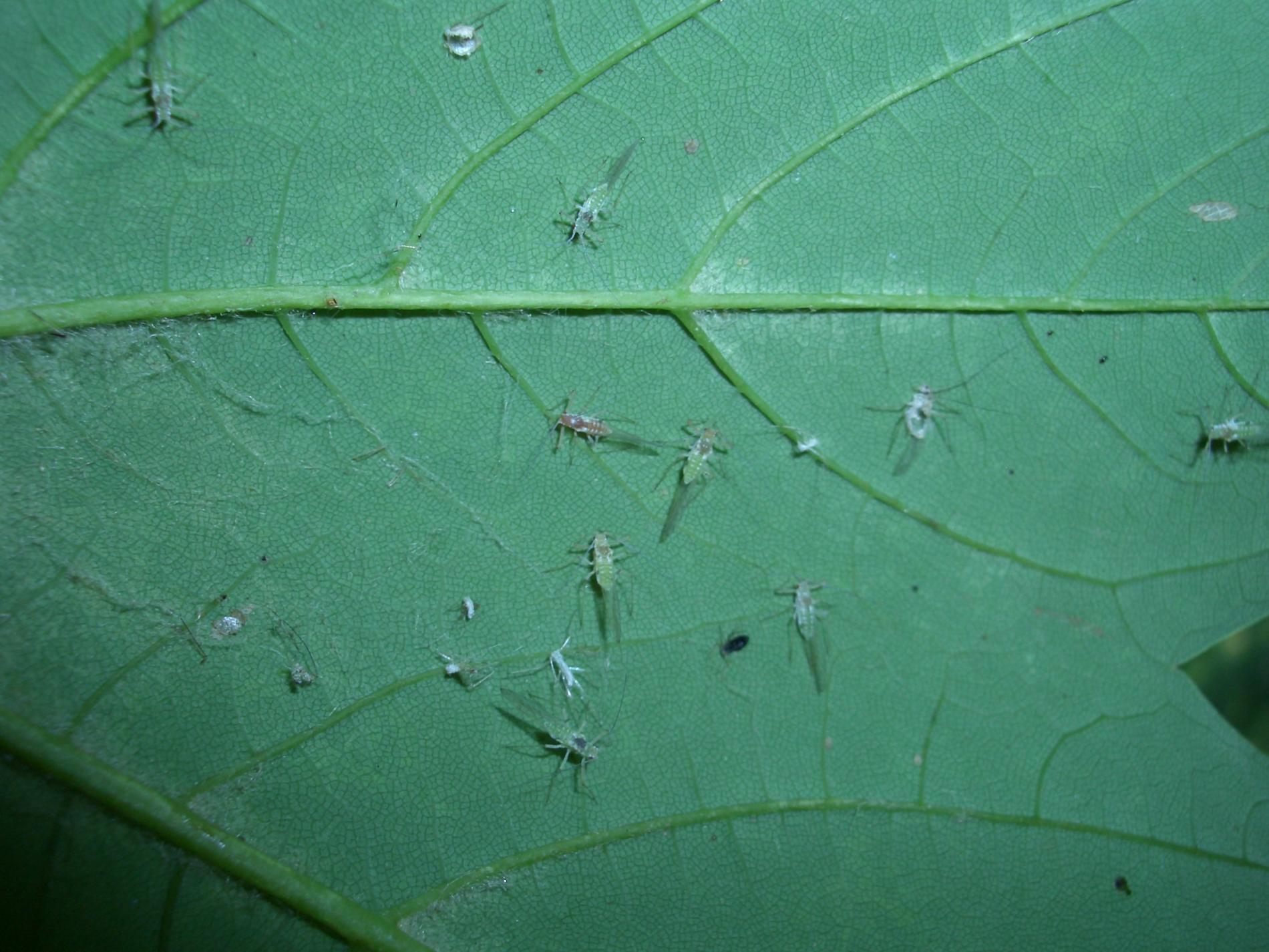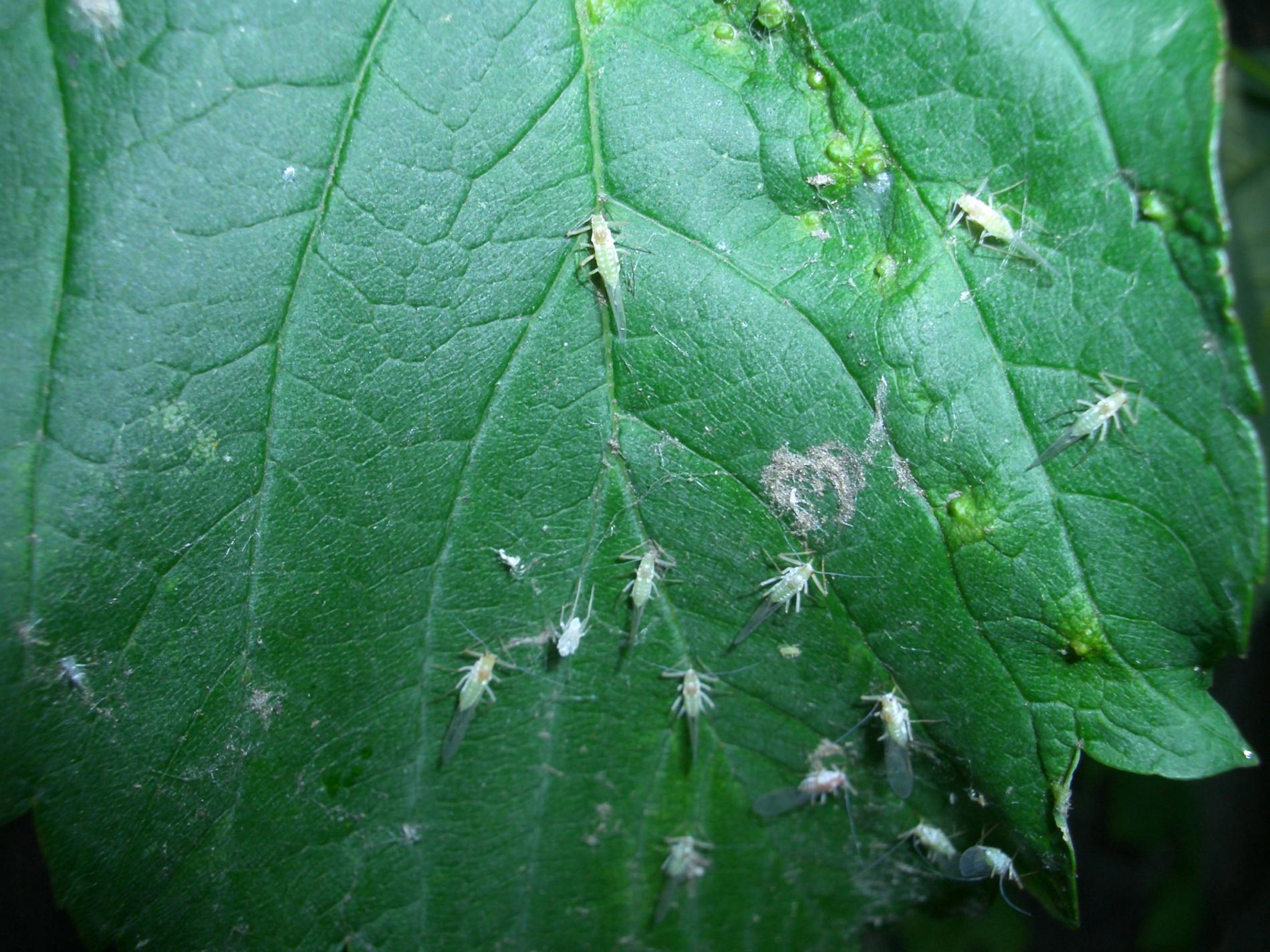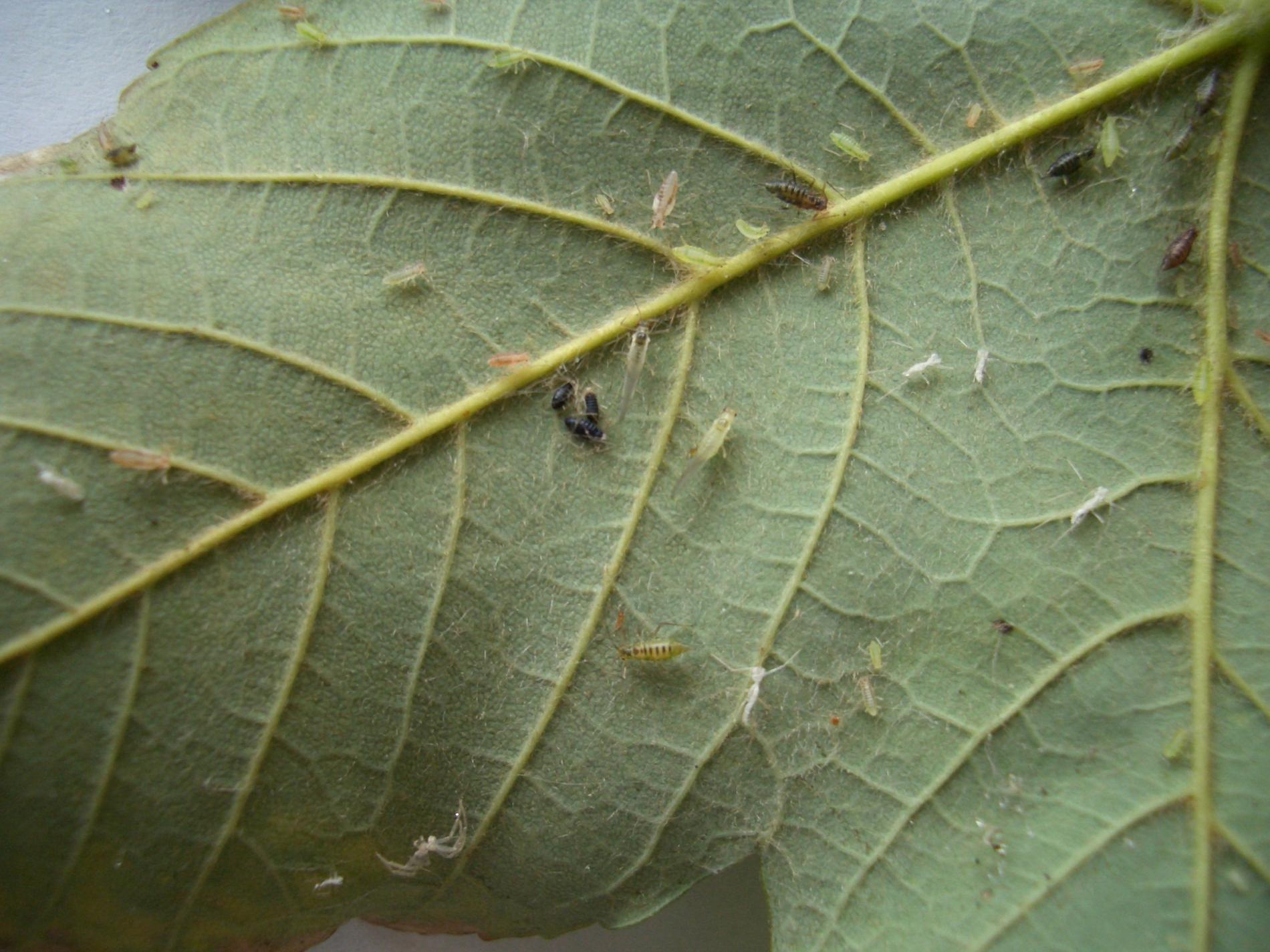 Listy sú stočené smerom nadol, majú chlorotické škvrny a na povrchu sa objavuje lepivá medovica. Na miestach pokrytých medovicou vzniká čierna pleseň a na spodnej strane listov sú viditeľné husté kolónie vošiek.