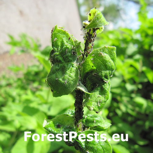 Na napadnutých listoch sú viditeľné deformácie, stáčanie a zakrpatenie výhonkov. Povrch listov býva pokrytý lepivou medovicou, na ktorej sa často tvorí čierna pleseň. Kolónie sa sústreďujú na stonky a spodnú stranu listov.