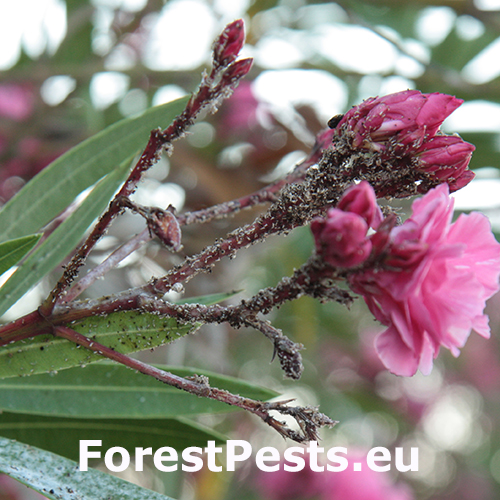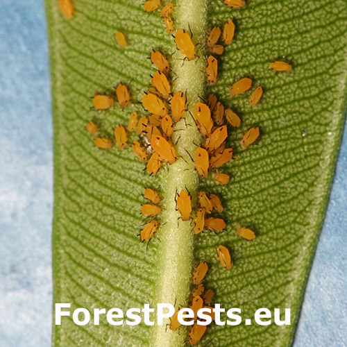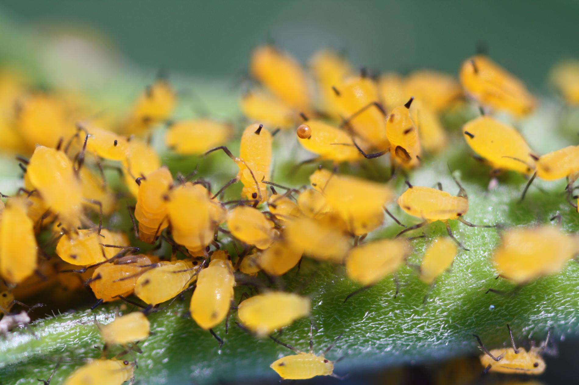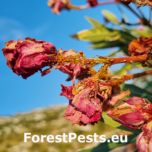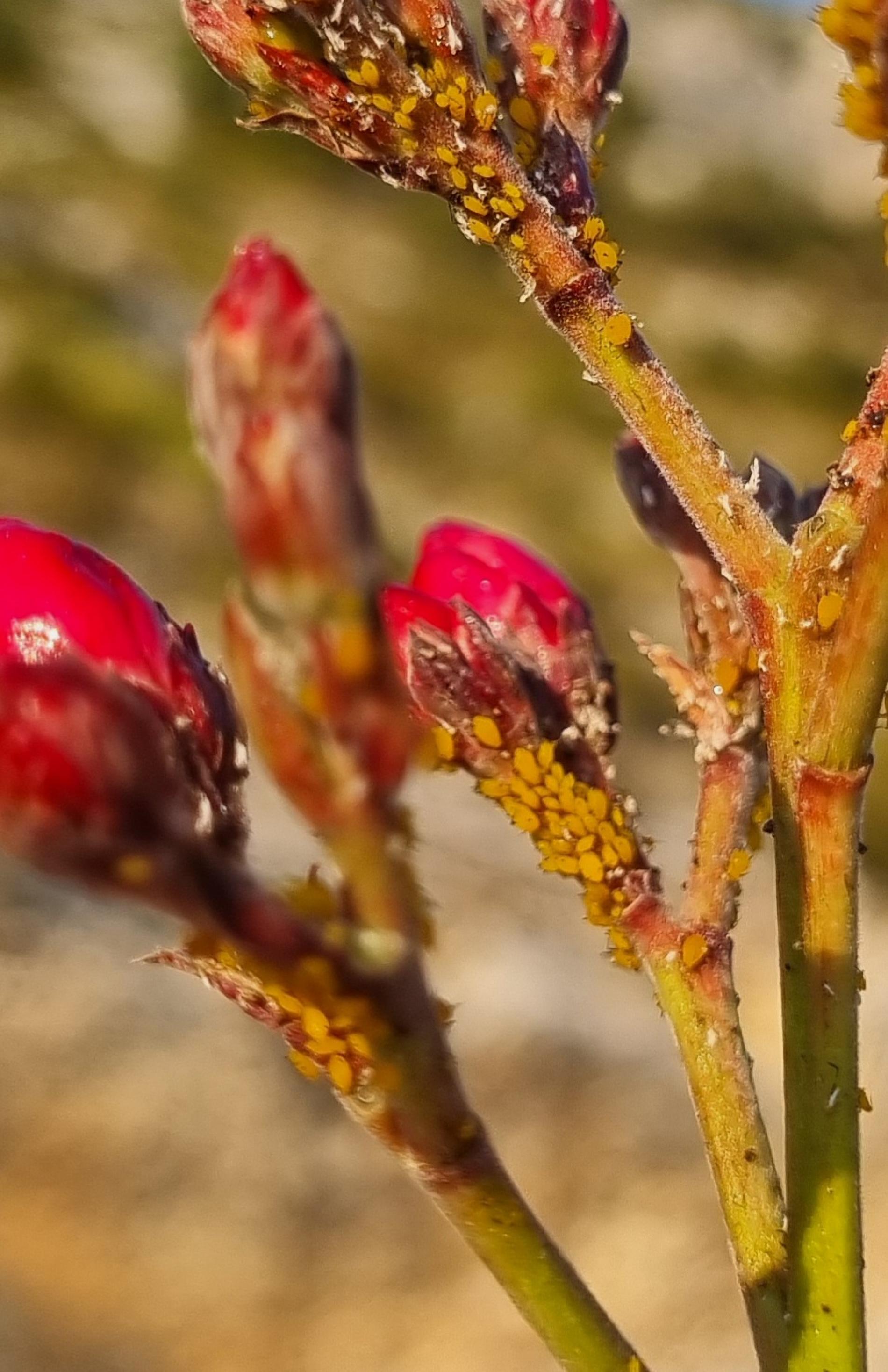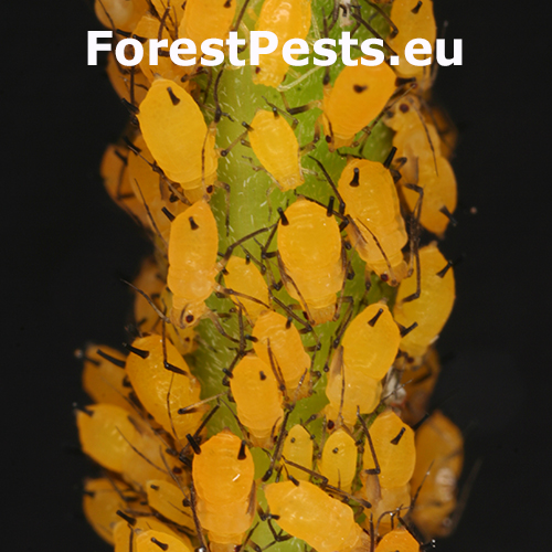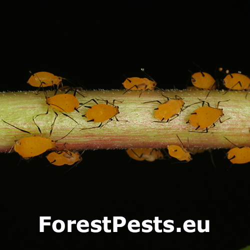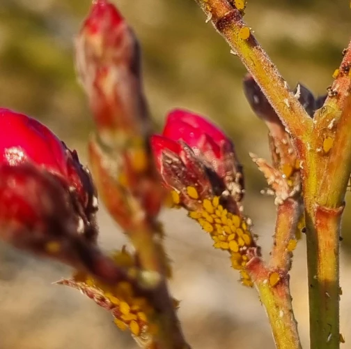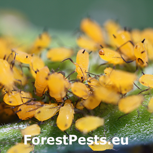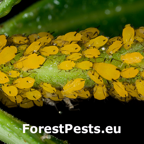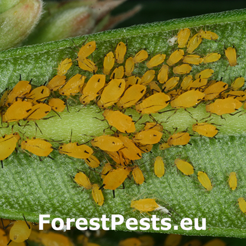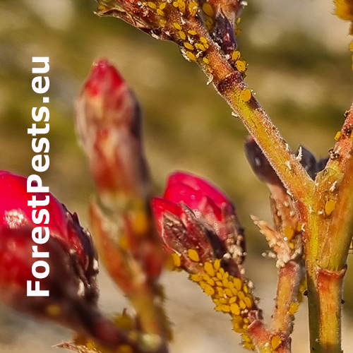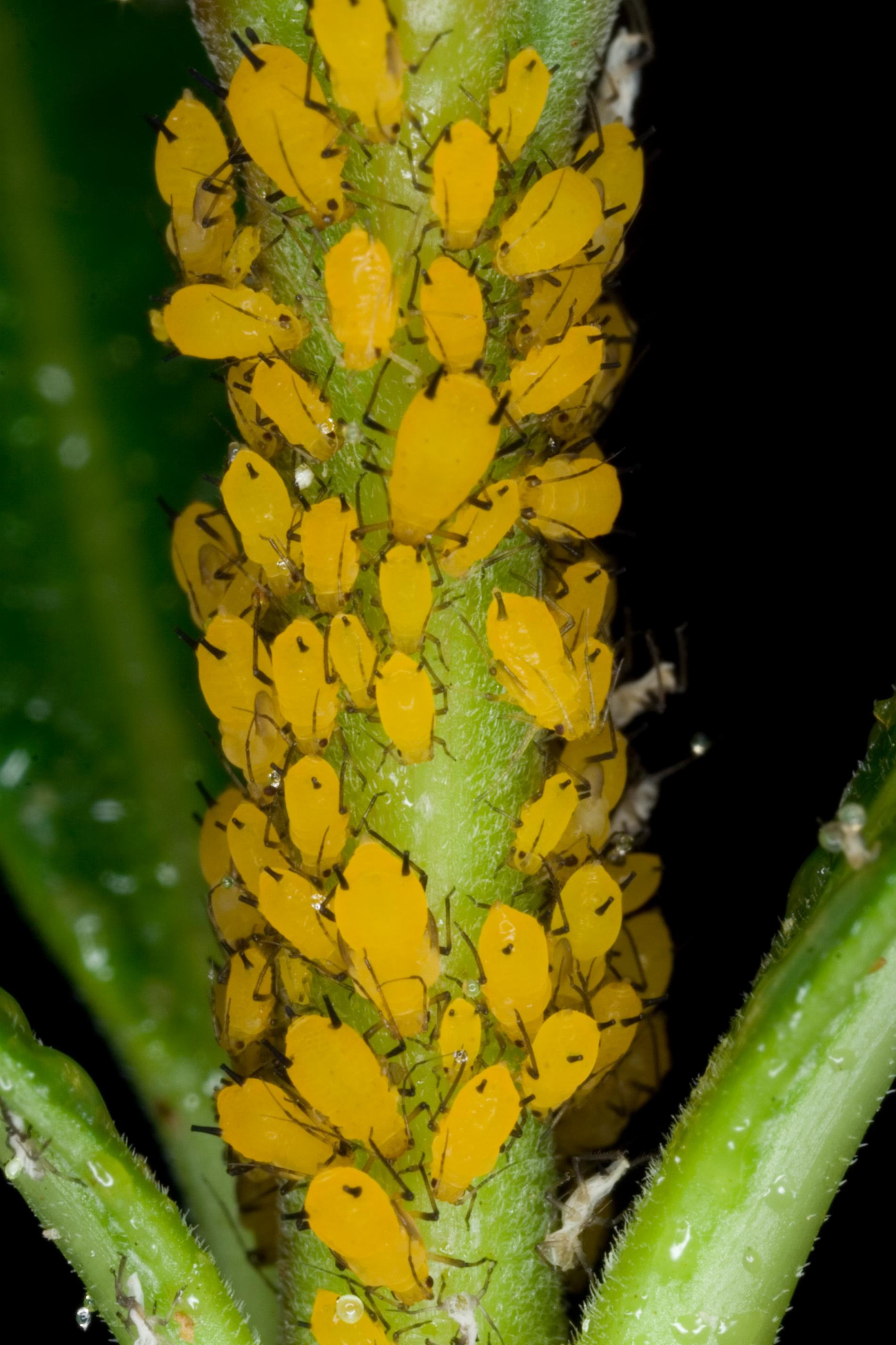 Žlté vošky na spodnej strane listov, kvetoch a na nových výhonkoch. Veľké kolónie.