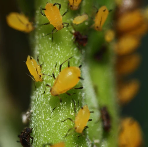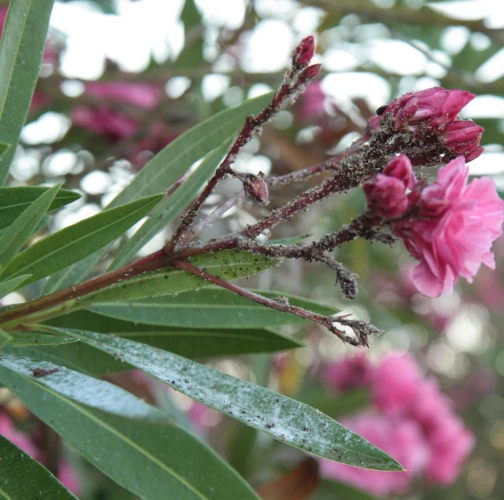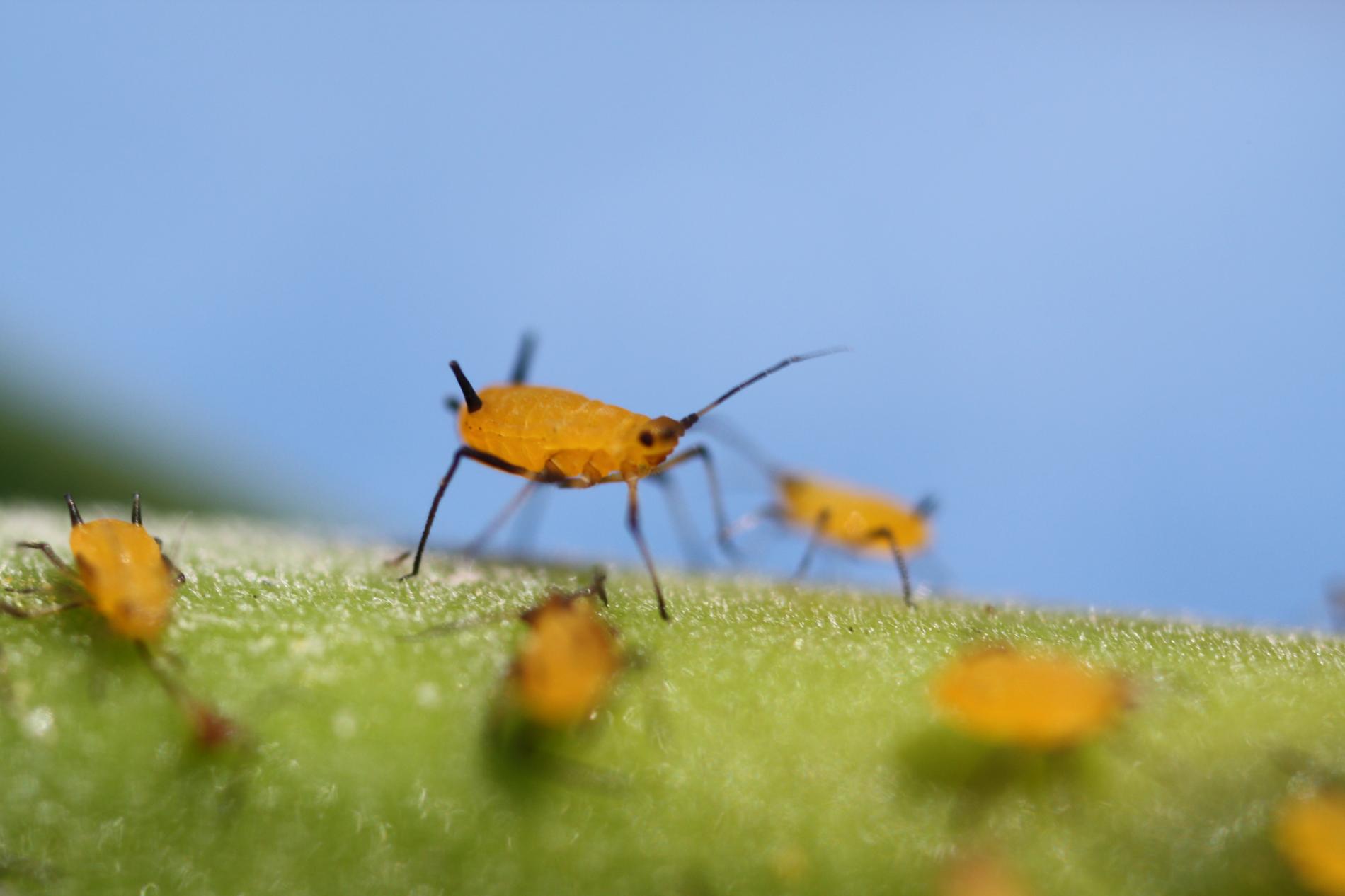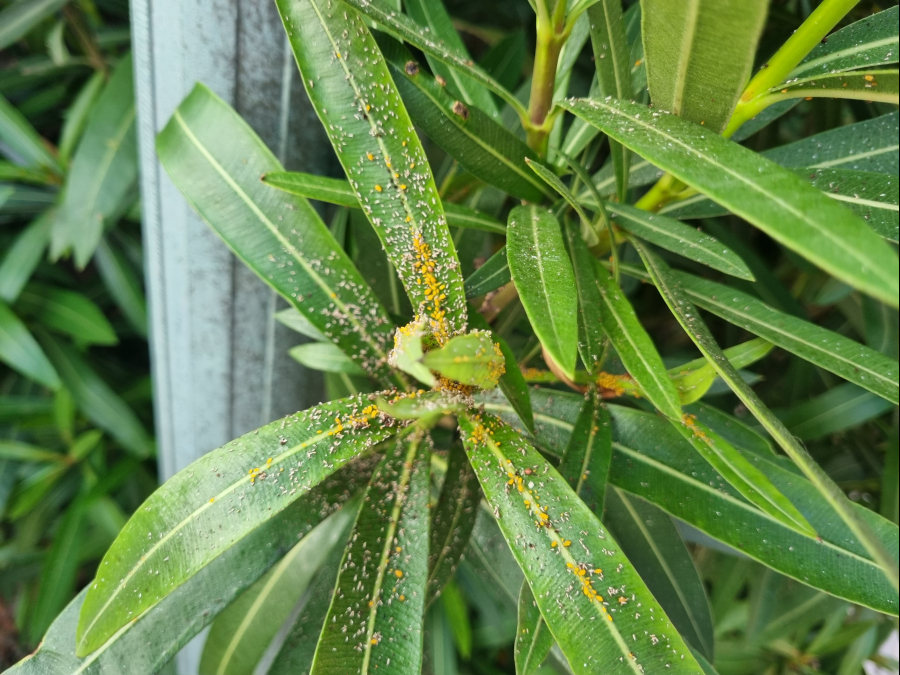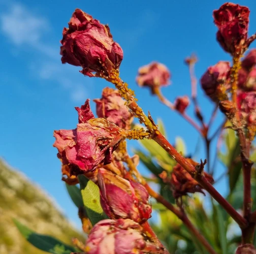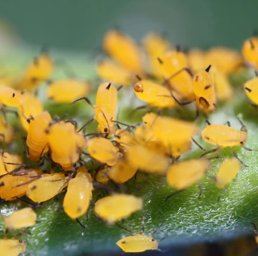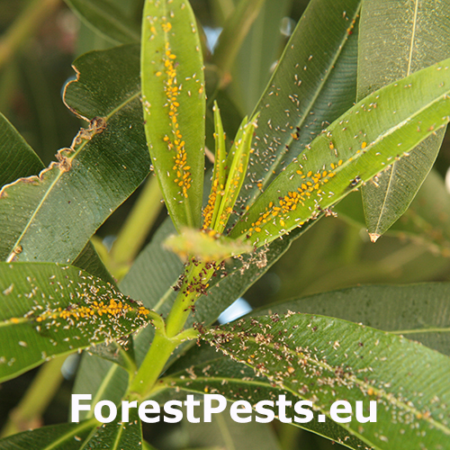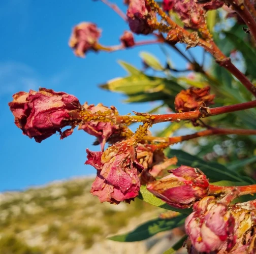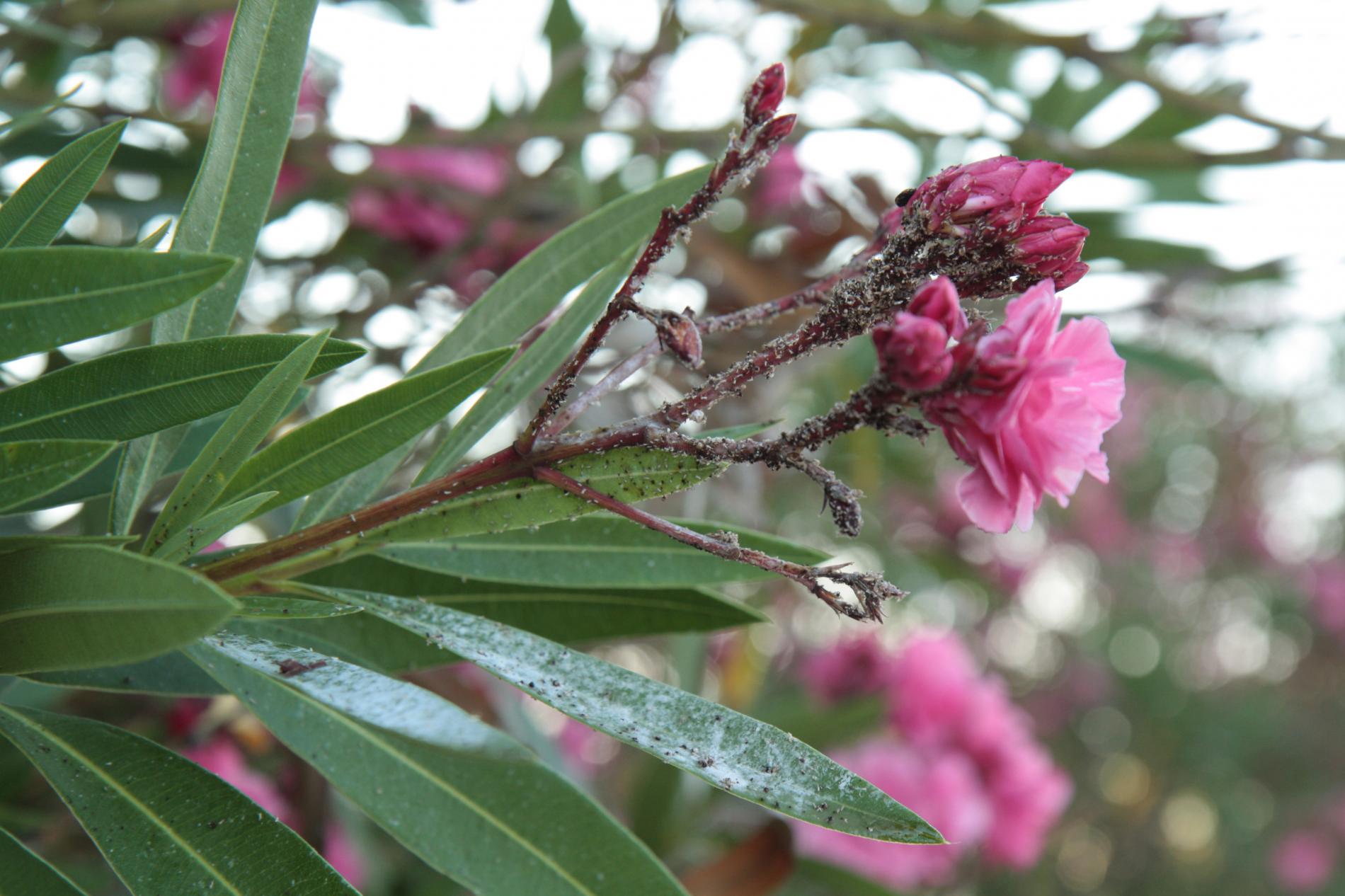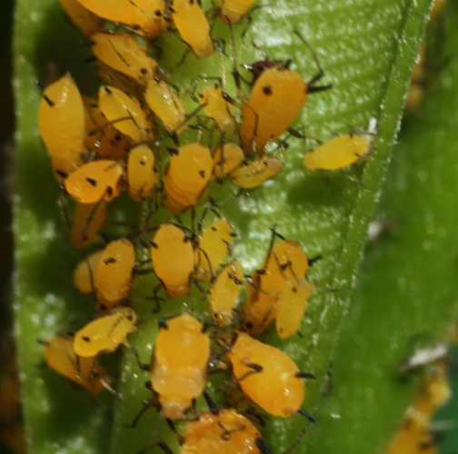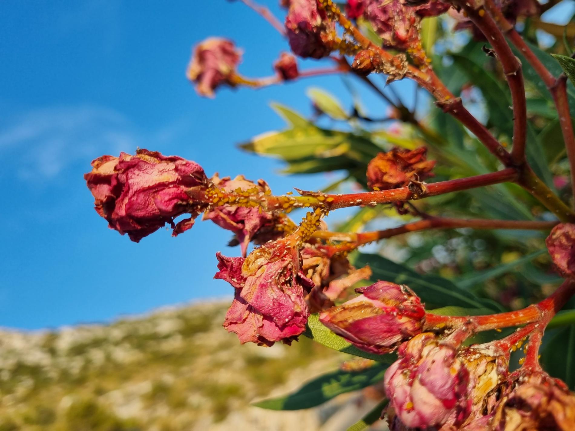 Žlté vošky na spodnej strane listov, kvetoch a na nových výhonkoch. Veľké kolónie.