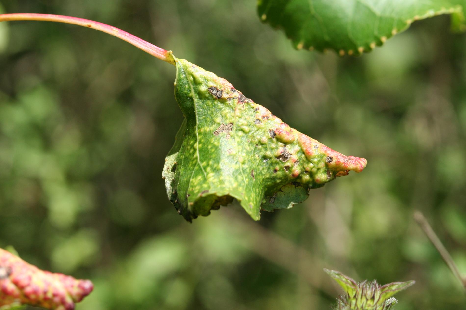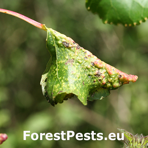 Okraje listov zrolované smerom nadol; na povrchu listov žltkasté až červenkasté pľuzgiere.