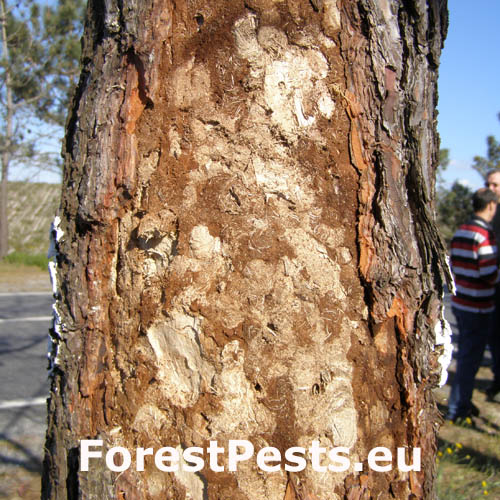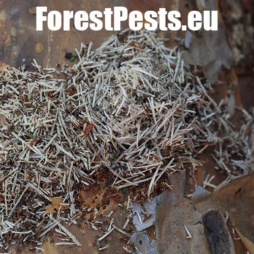 Požerky pod kôrou pevne upchávajú drobnými koncentricky usporiadanými trieskami.