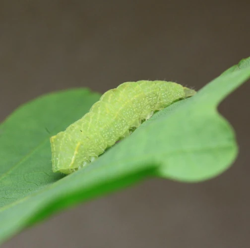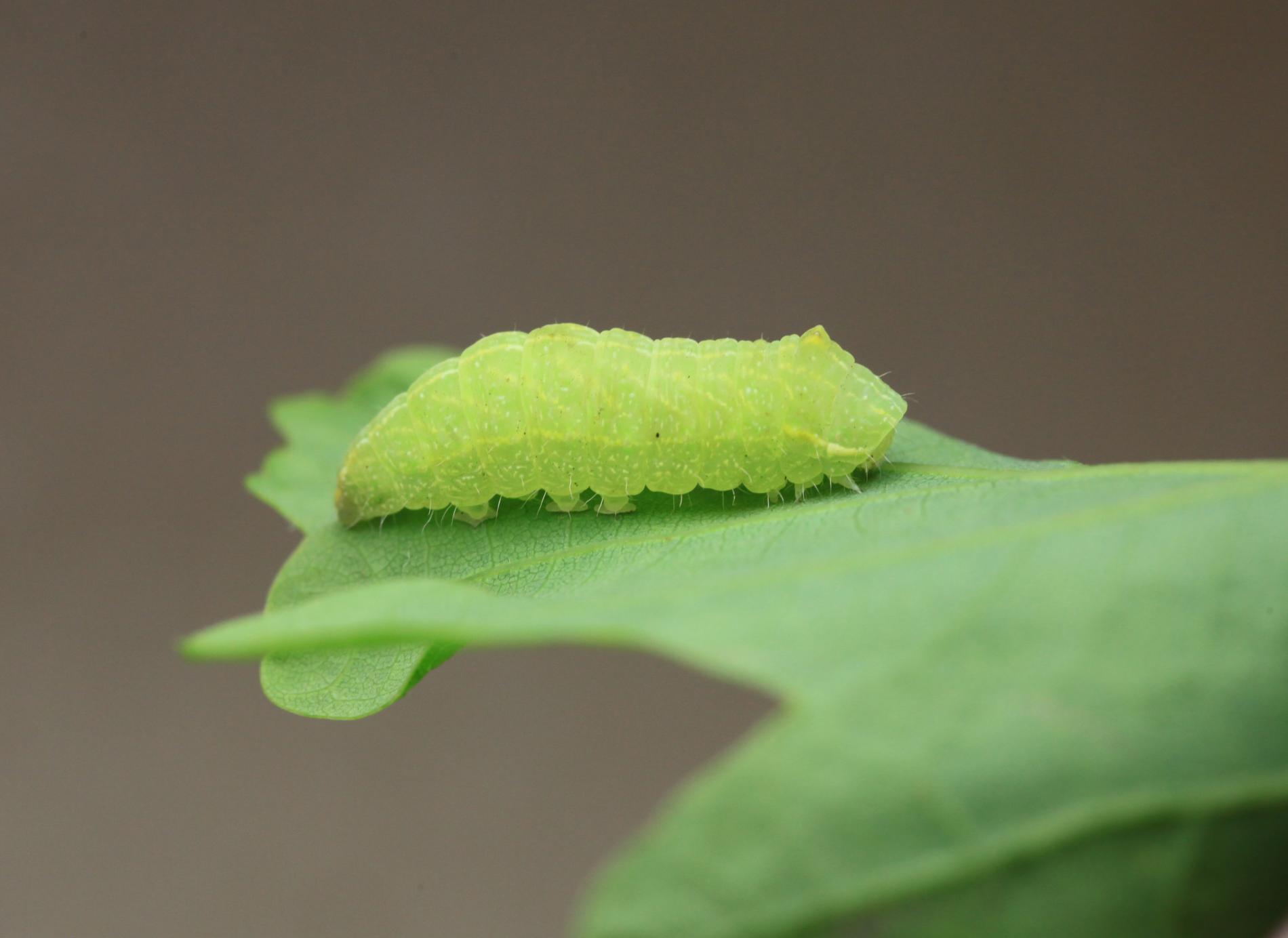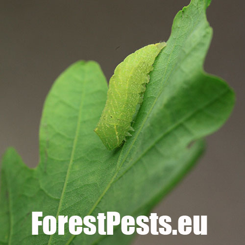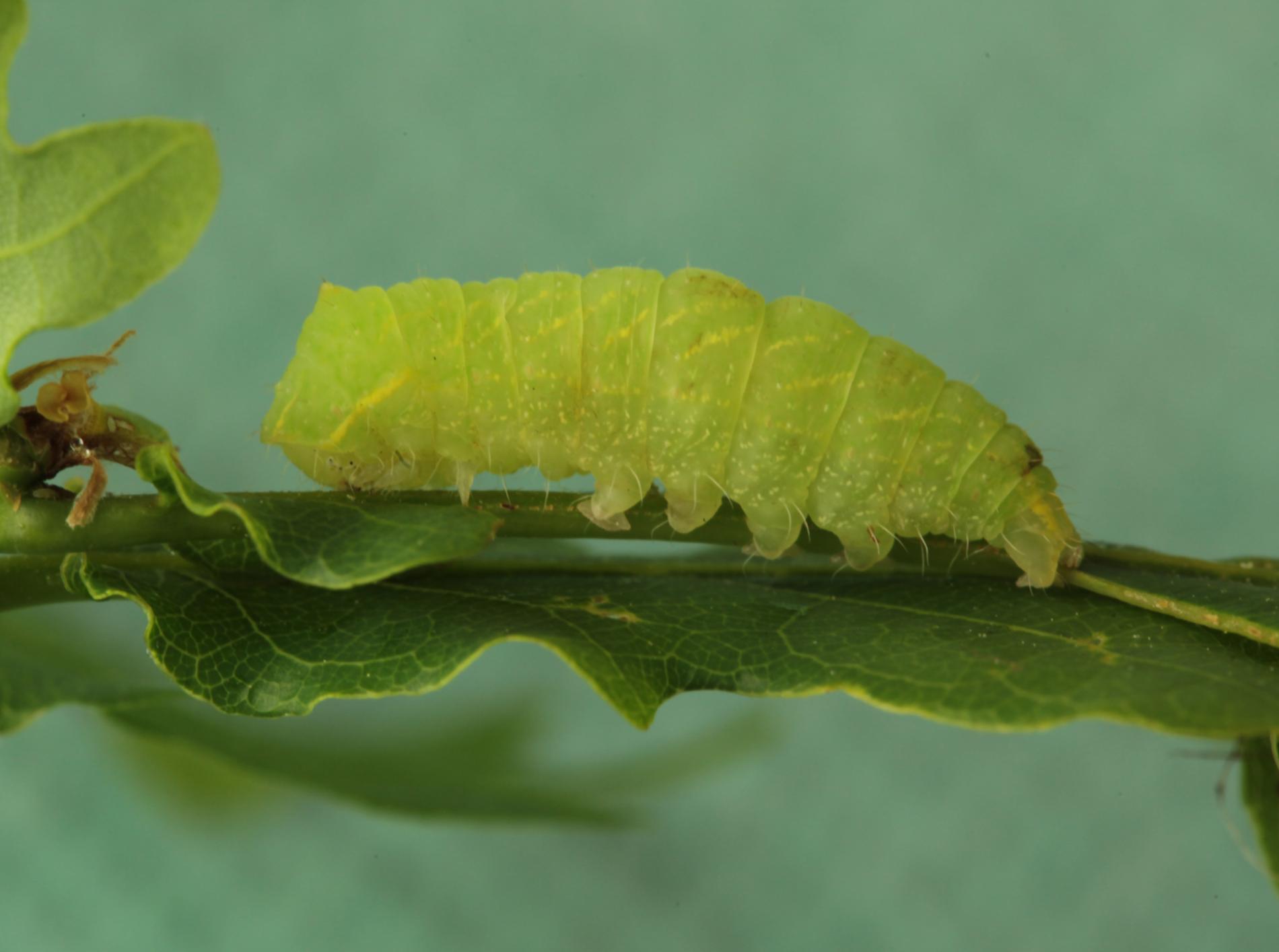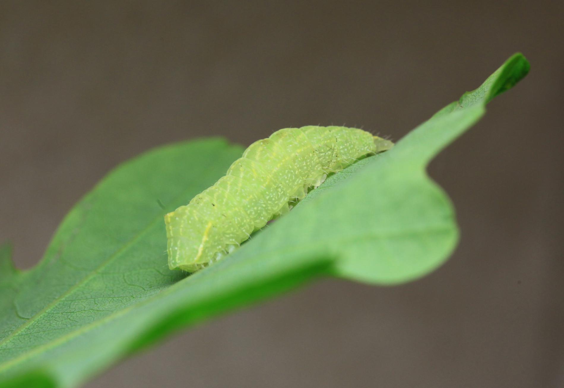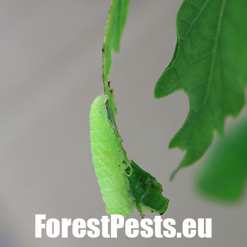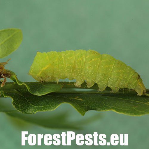 Húsenica je zelená. Má za hlavou žltý pásik, je masívna a často sedí tak, akoby mala tesne za hlavou vyvýšeninu. Žer v horných častiach koruny. V listoch sú diery, prípadne sú ožrené z bokov.