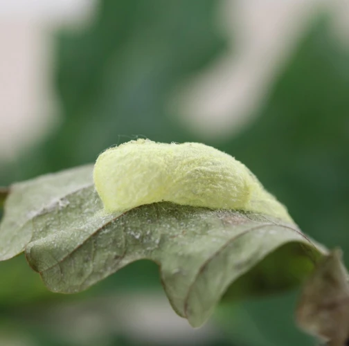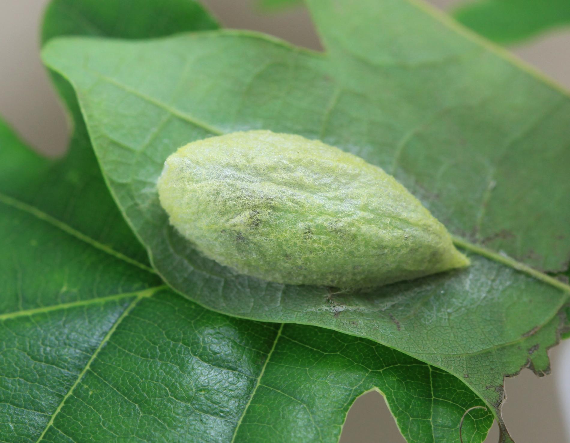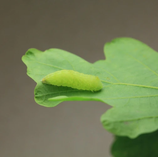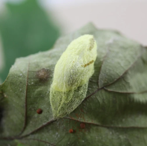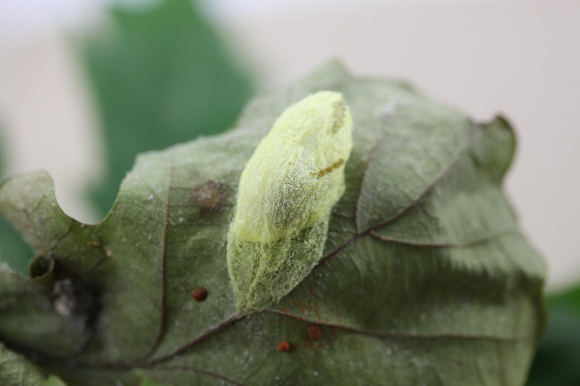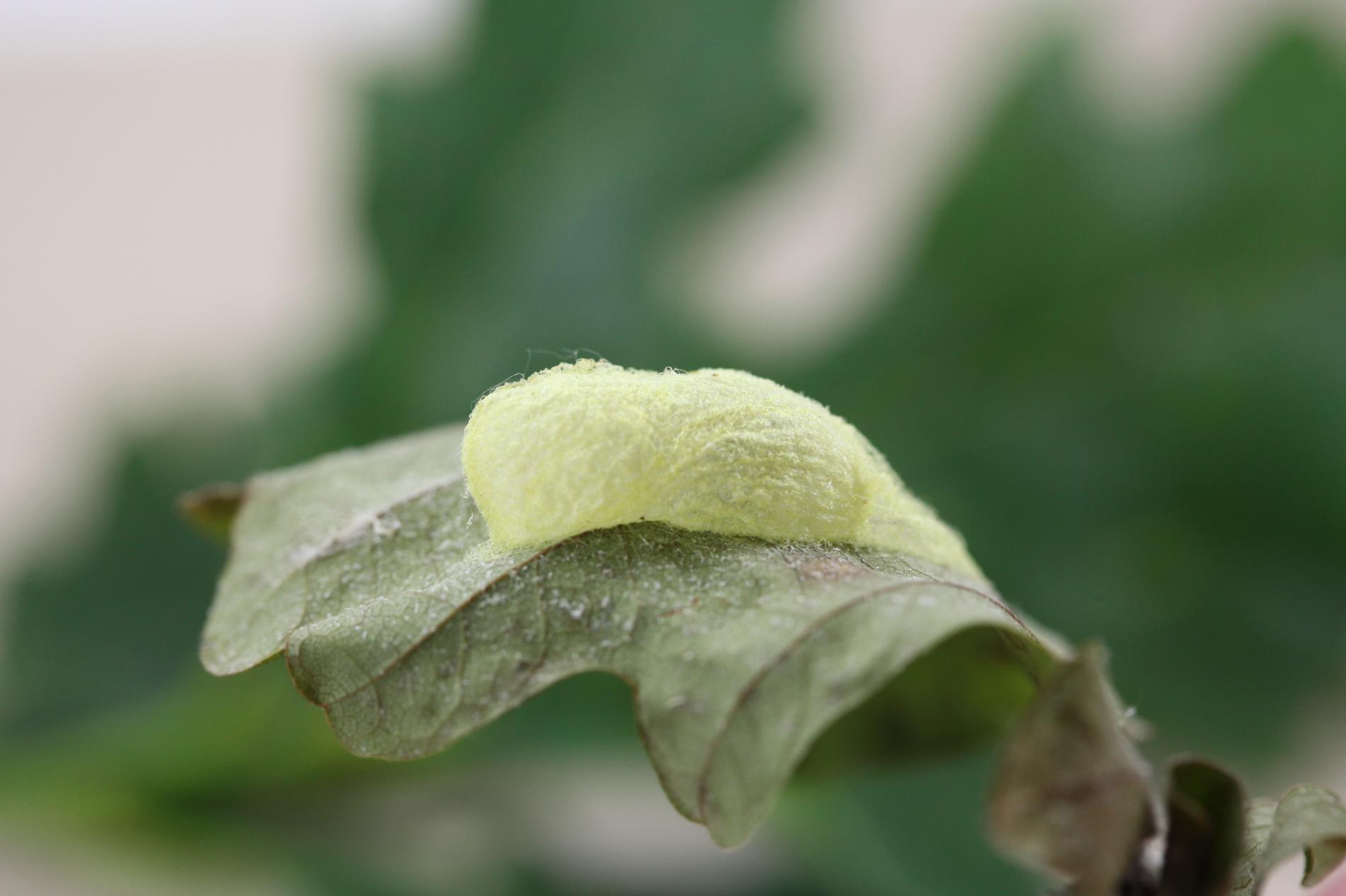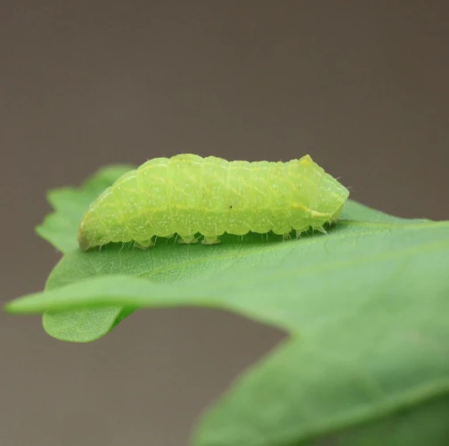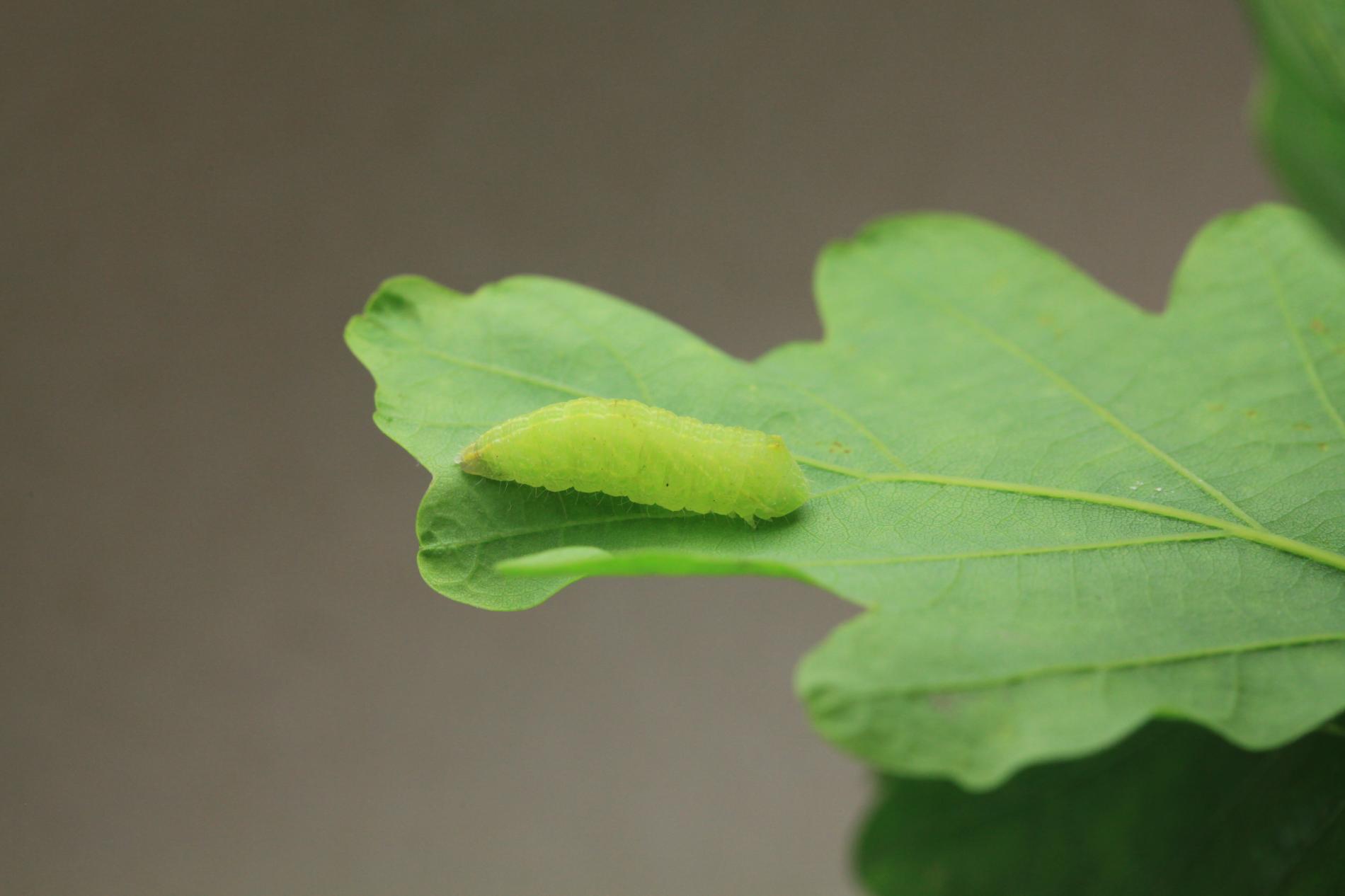 Húsenica je zelená. Má za hlavou žltý pásik, je masívna a často sedí tak, akoby mala tesne za hlavou vyvýšeninu. Žer v horných častiach koruny. V listoch sú diery, prípadne sú ožrené z bokov.