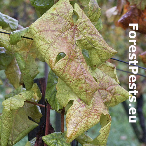 Na napadnutých listoch bielych odrôd hrozna je typické zlatožlté sfarbenia, pri červených odrodách červenanie; listy sa môžu skrúcať, okraje sa stáčajú nadol a výhony zostávajú mäkké a nezdrevnatené.
