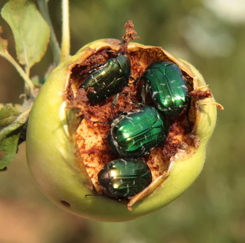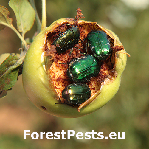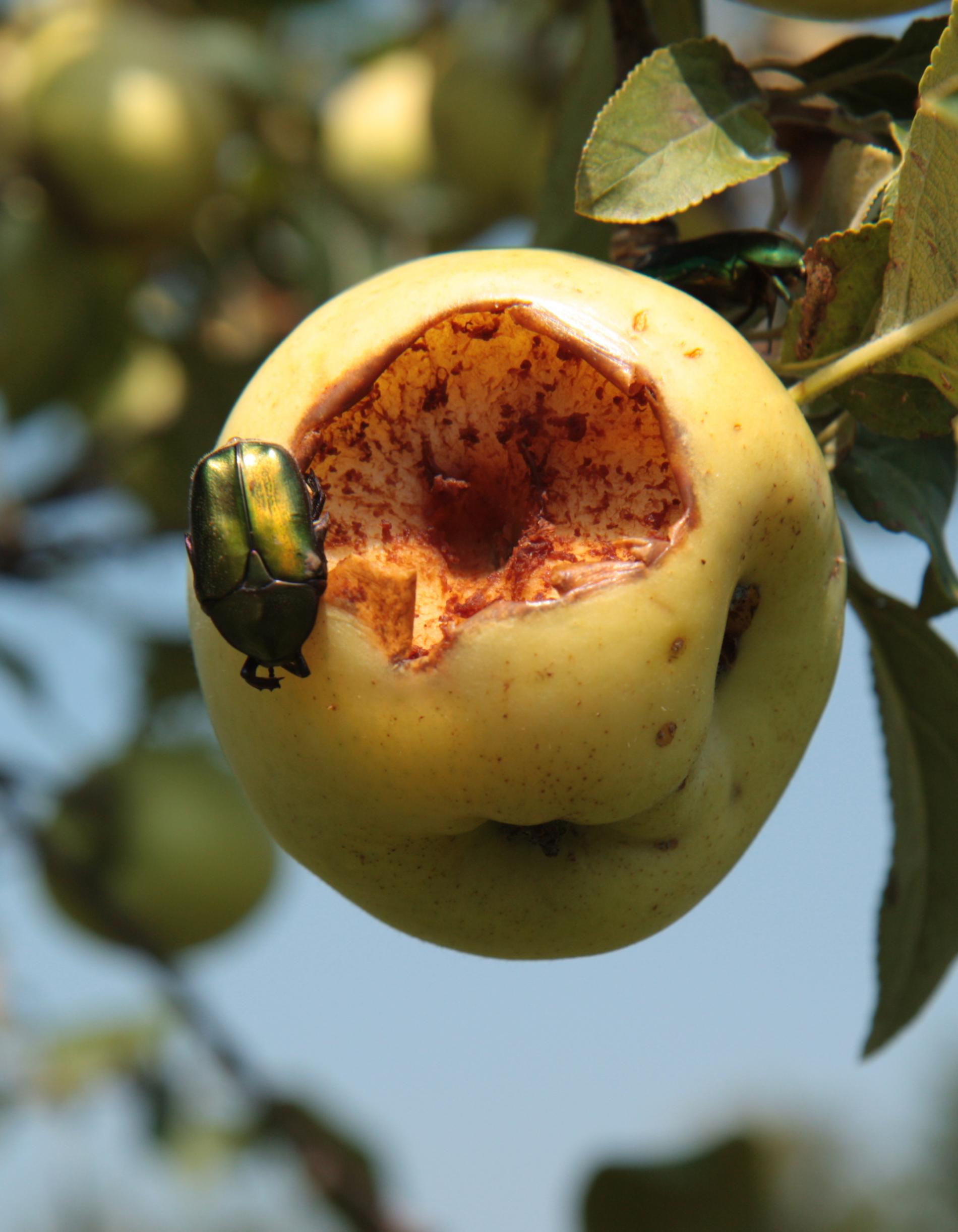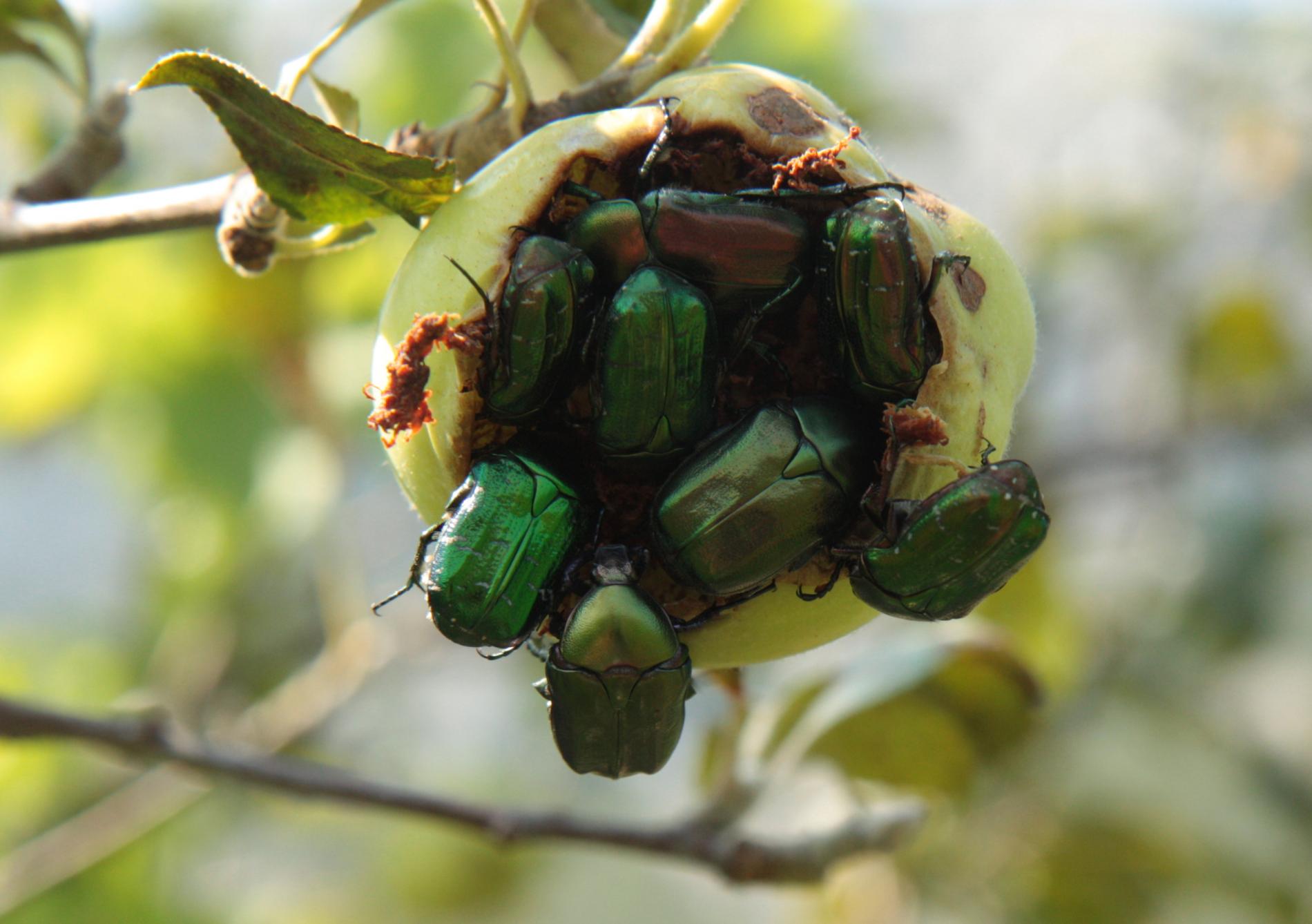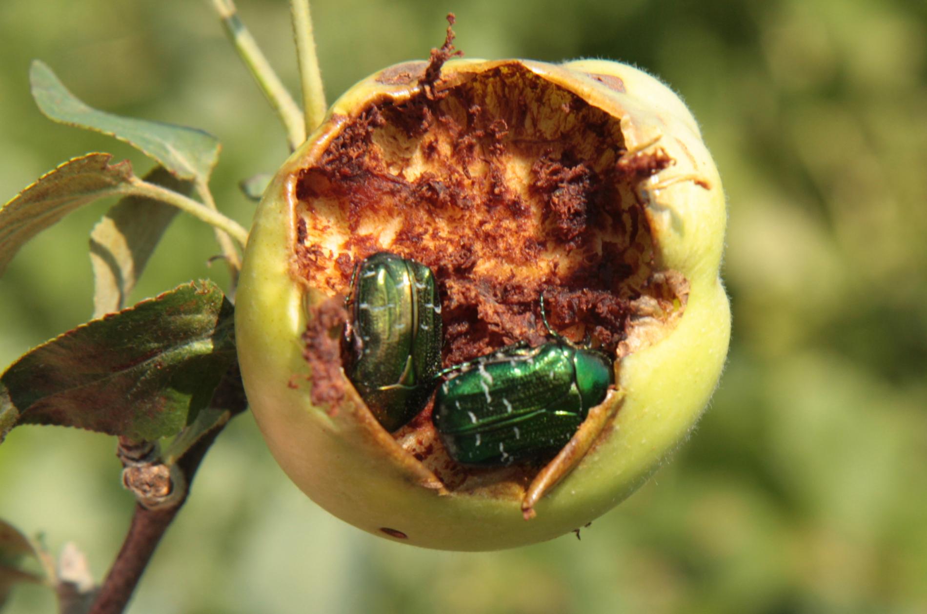 Poškodenie plodov. Jamky, dutiny, skonzumované celé plody. Kovovo lesklé, stredne veľké chrobáky na plodoch.