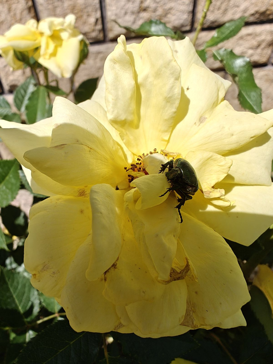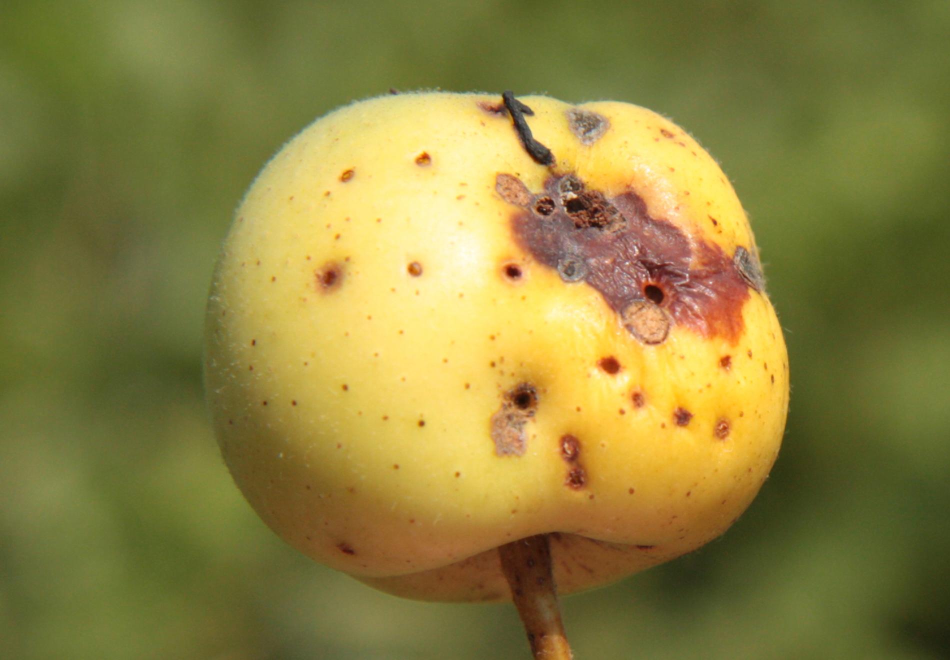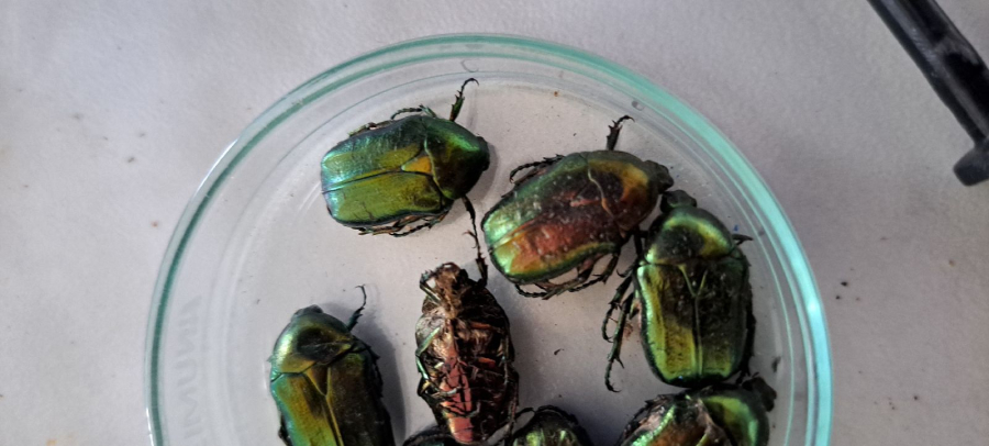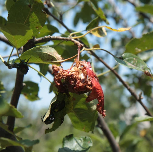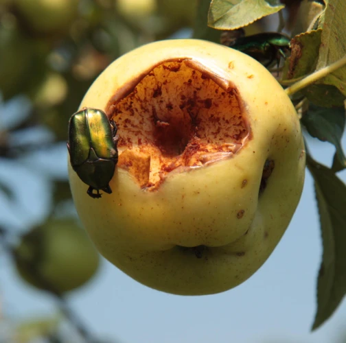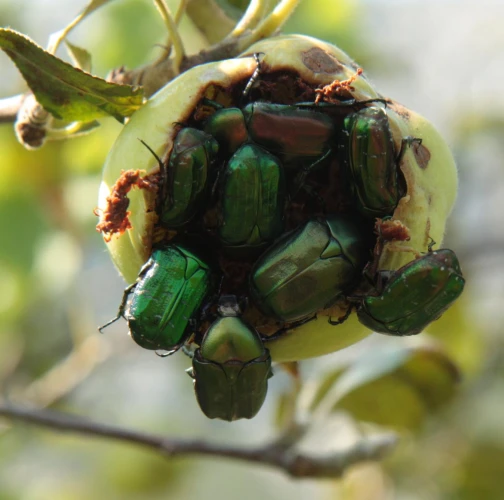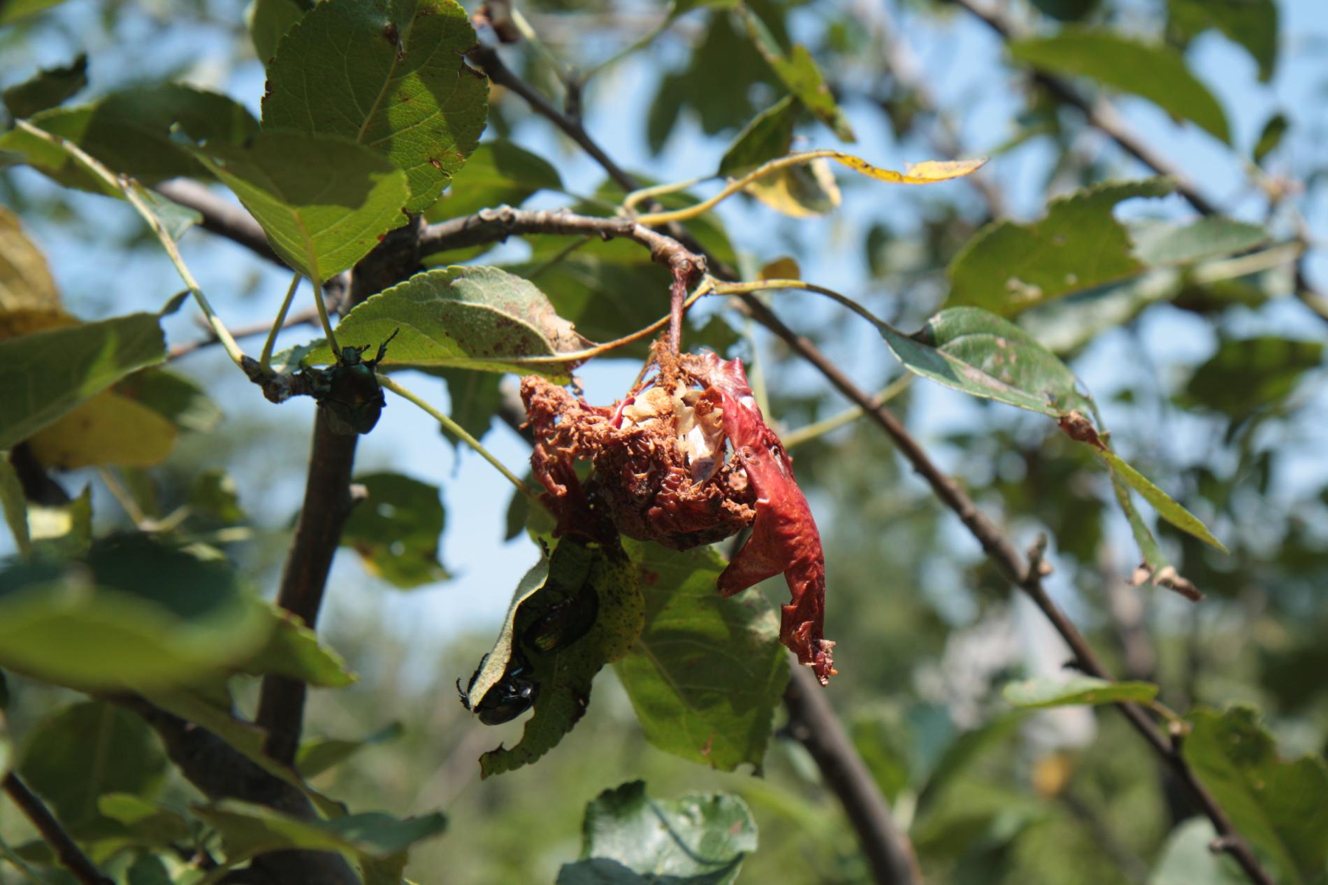 Poškodenie plodov. Jamky, dutiny, skonzumované celé plody. Kovovo lesklé, stredne veľké chrobáky na plodoch.