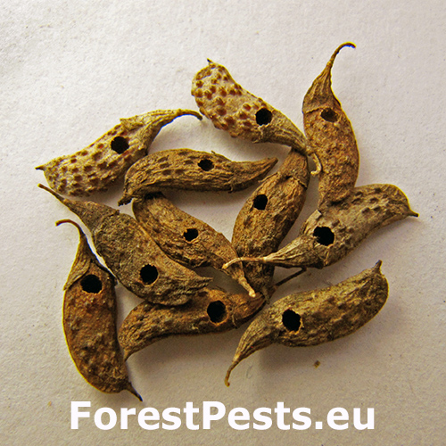 Napadnuté semená majú dutiny spôsobené žerom lariev. Výrazné výletové otvory na semenách. Struky môžu na povrchu vyzerať neporušene, ale sú ľahké v dôsledku prázdnych semien. Pri silnom napadnutí dochádza k zníženiu produkcie a klíčivosti semien a vo vnútri strukov je viditeľný trus, čo tento druh odlišuje od podobných druhov.