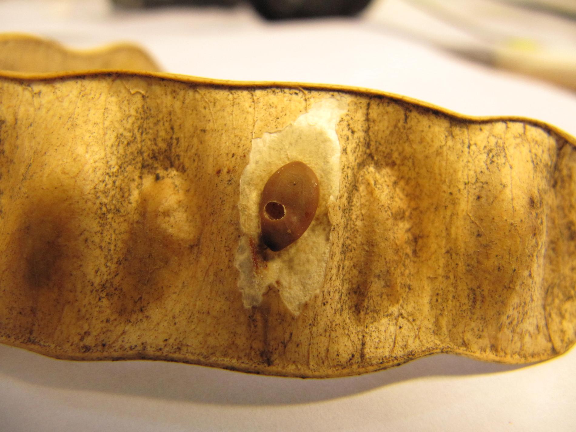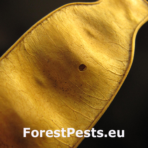Napadnuté struky semien vykazujú malé kruhové výletové otvory, ktorými dospelé chrobáky opúšťajú semená. Semená vo vnútri sú vyžraté, často s viditeľným trusom. Struky môžu byť scvrknuté alebo poškodené.