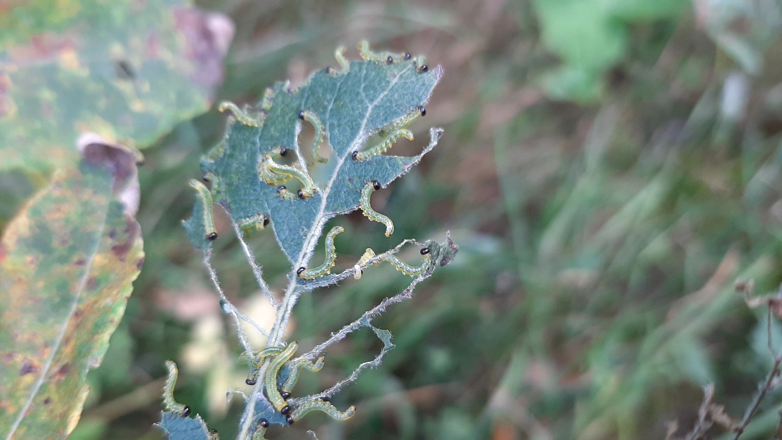 Ďakujeme za dotaz. Na fotke sú larvy piliarky (Symphyta, Tenthredinidae), ktoré skeletujú listy vŕby (Salix). Najpravdepodobnejšie ide o druh Nematus pavidus, no existuje aj niekoľko iných veľmi podobných druhov. S pozdravom M. Zúbrik